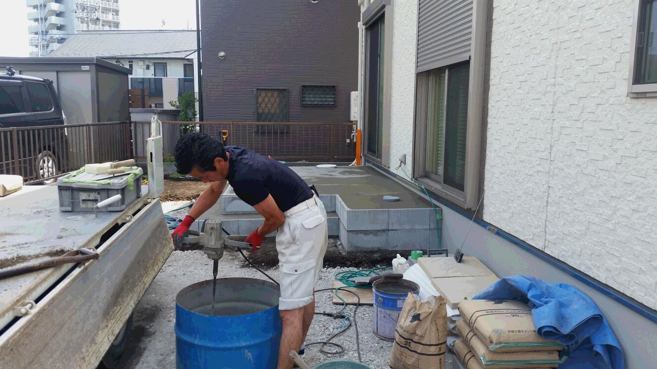工事が始まったばかりでタイルのテラスも躯体が出来上がったばかり、担当職人の深谷氏が丁寧に丹精込めて作業に取り組んでいます。