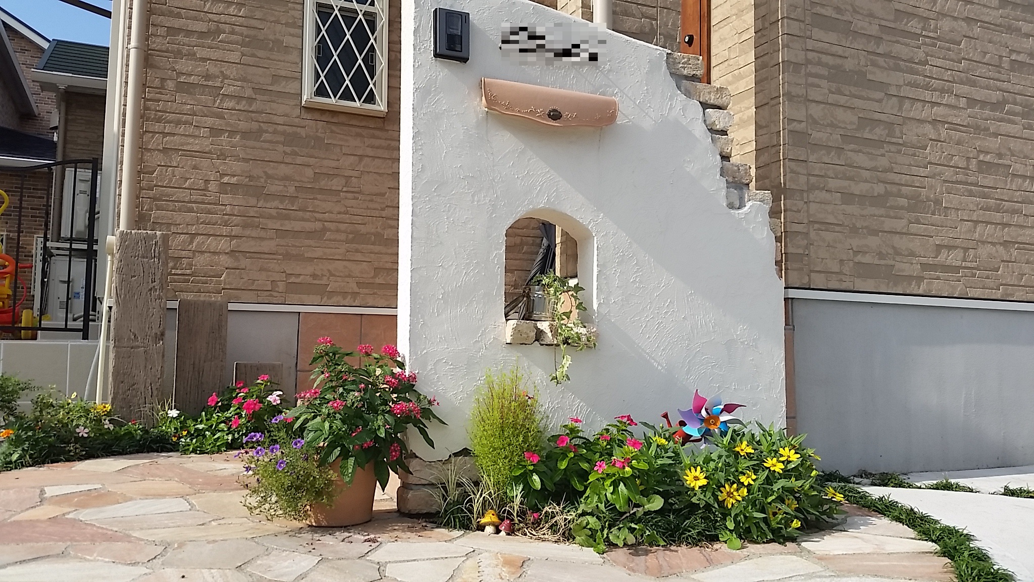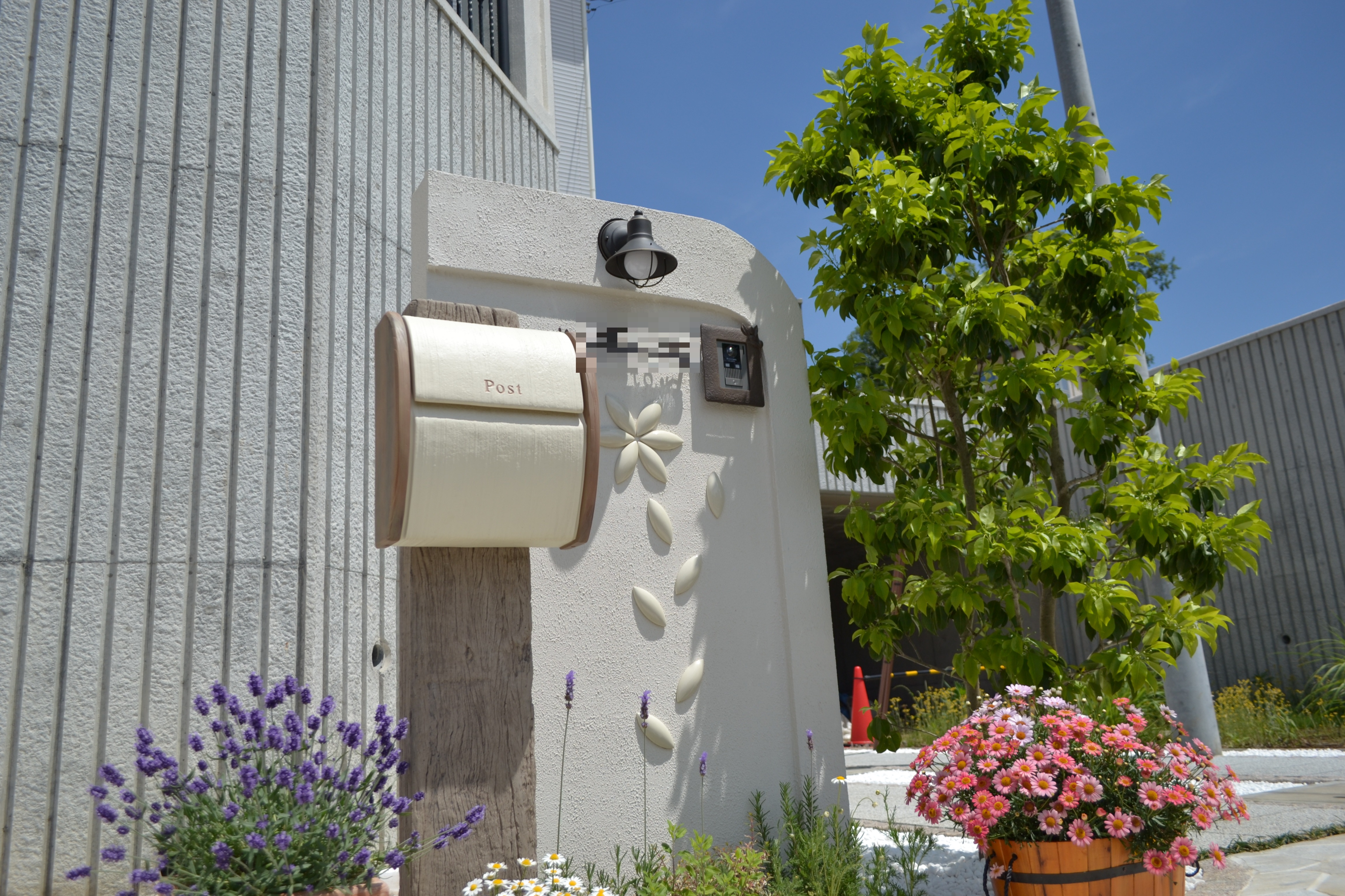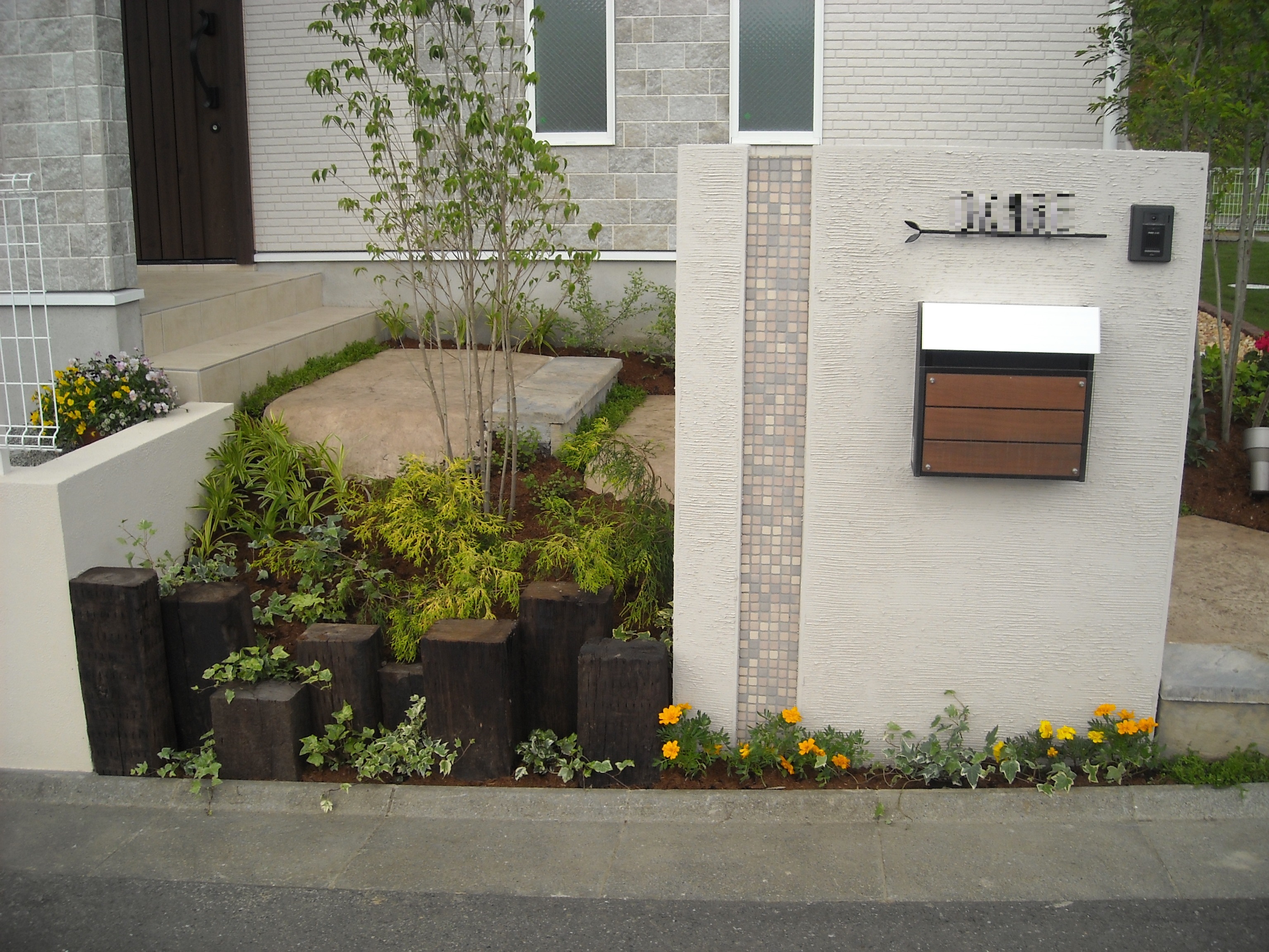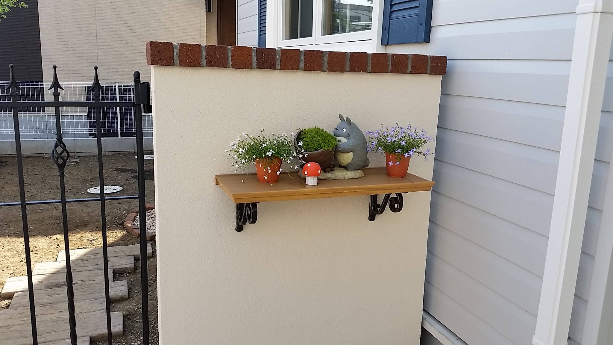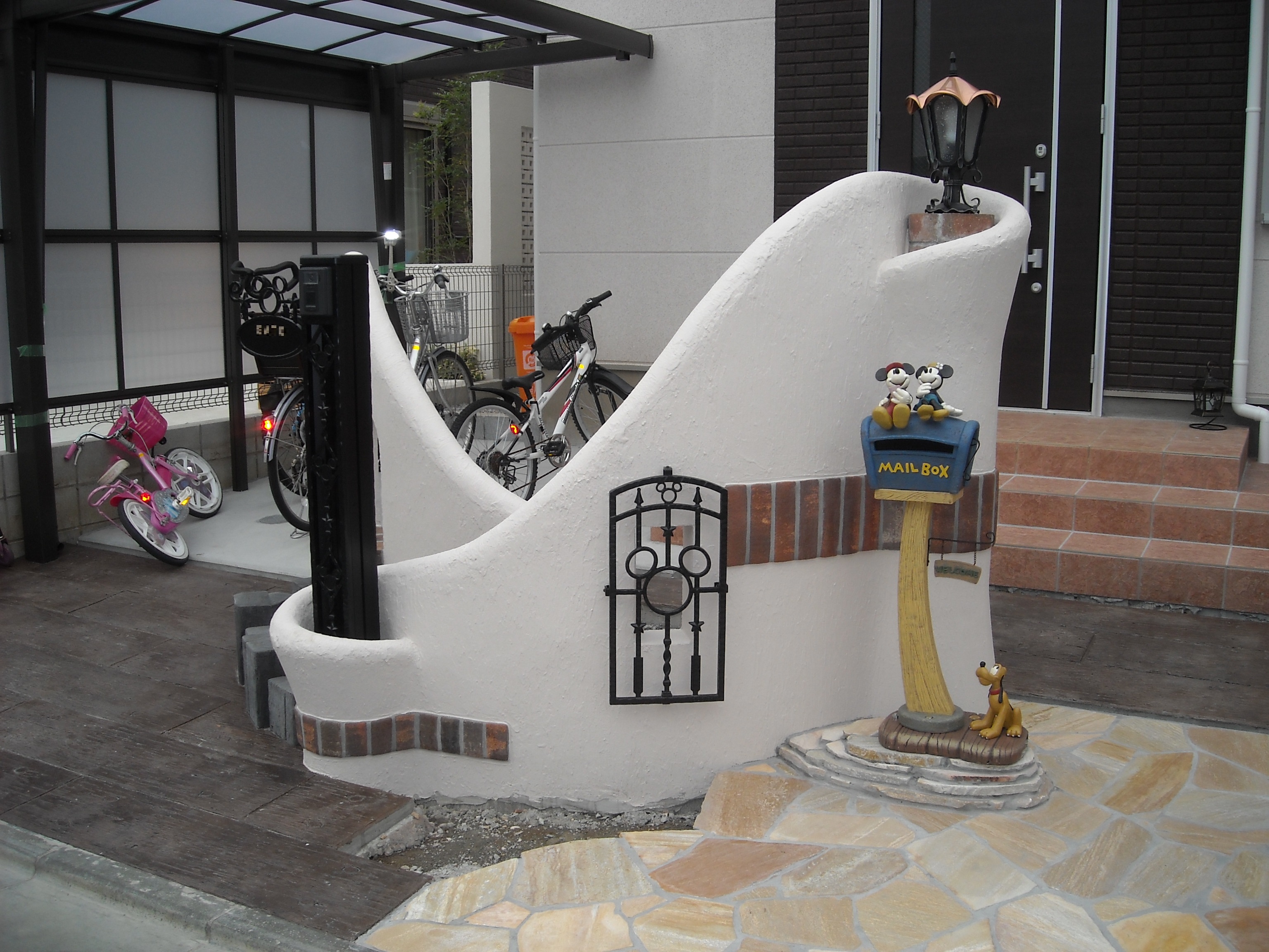 お客様な頼まれてテーマはディズニー!作るのに苦労した現場ですが喜んでもらえてうれしかったです。現在可愛い花やシンボルツリーに囲まれてお洒落な門周りとなってます。