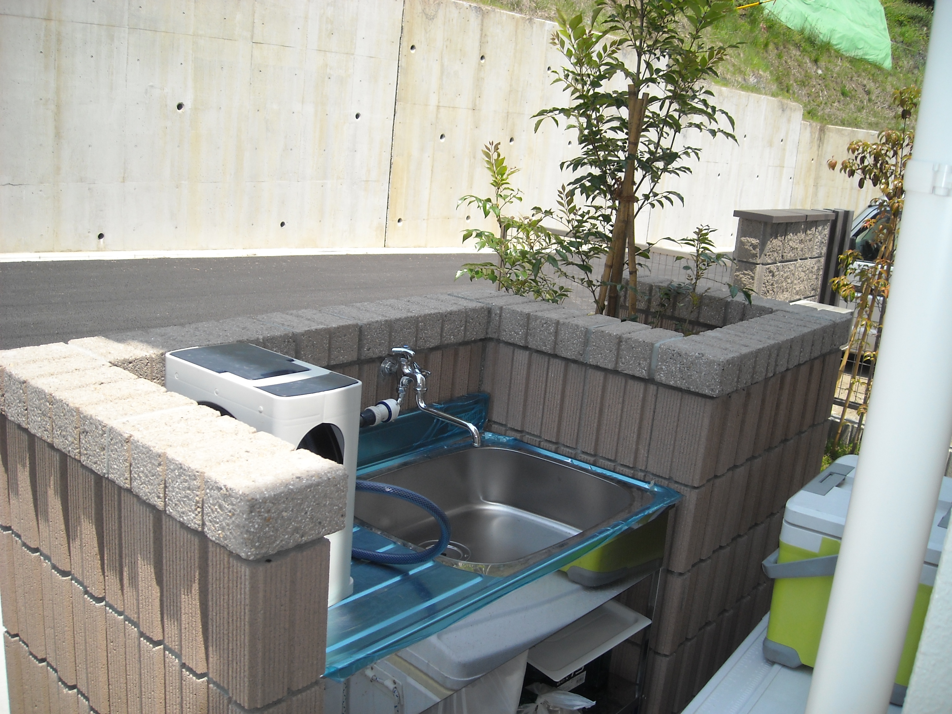 こちらの現場では、普通に化粧ブロックで門を作っていますが、実は、門の後ろにステンレスのシンクが隠れてるんです。