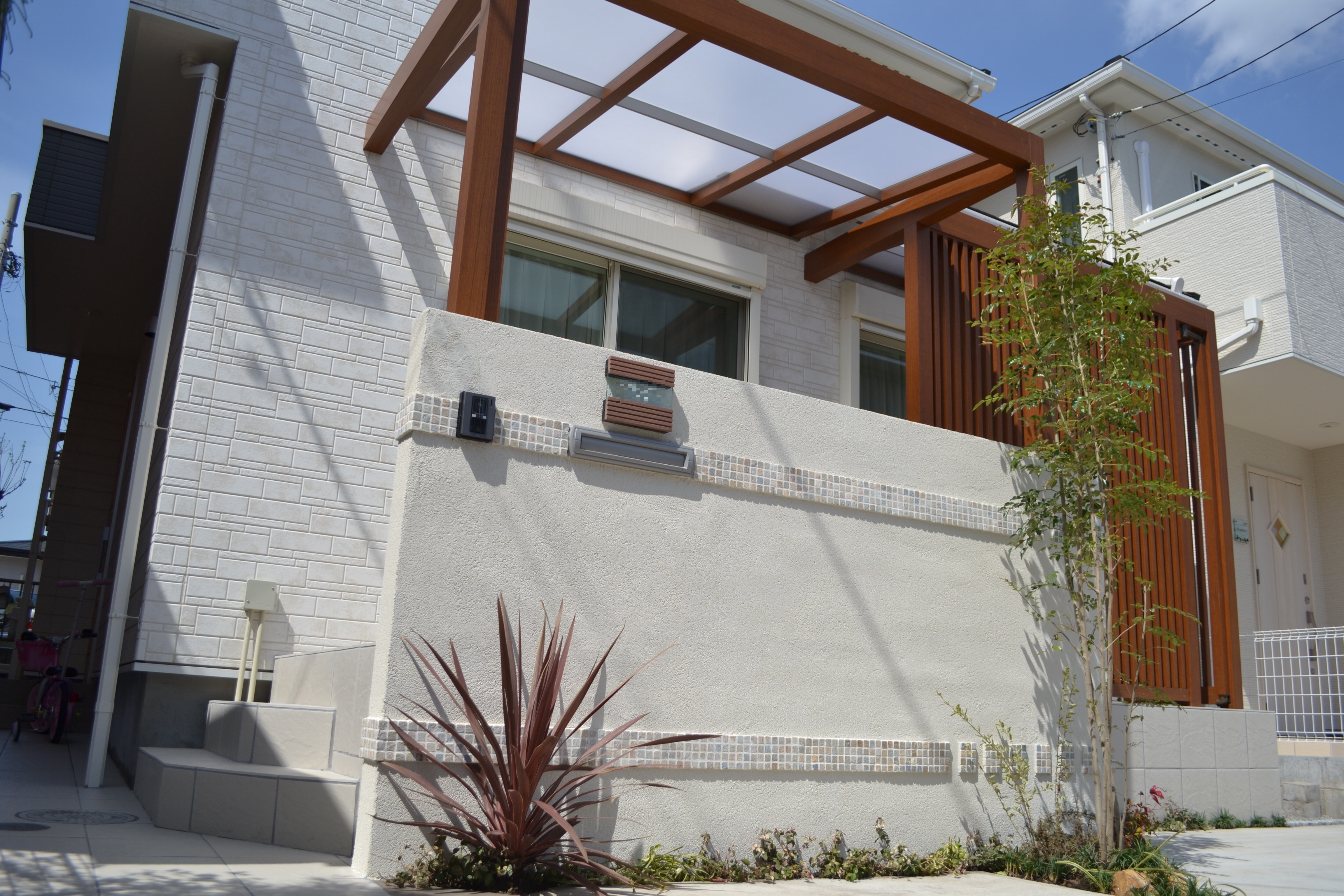 家をより良く引き立てる外構工事、オリジナルな門周り・エントランス・タイルデッキ・ウッドデッキ・ガーデンルーム・外構リフォームの事なら(有)新建エクスプランニングへお任せください。