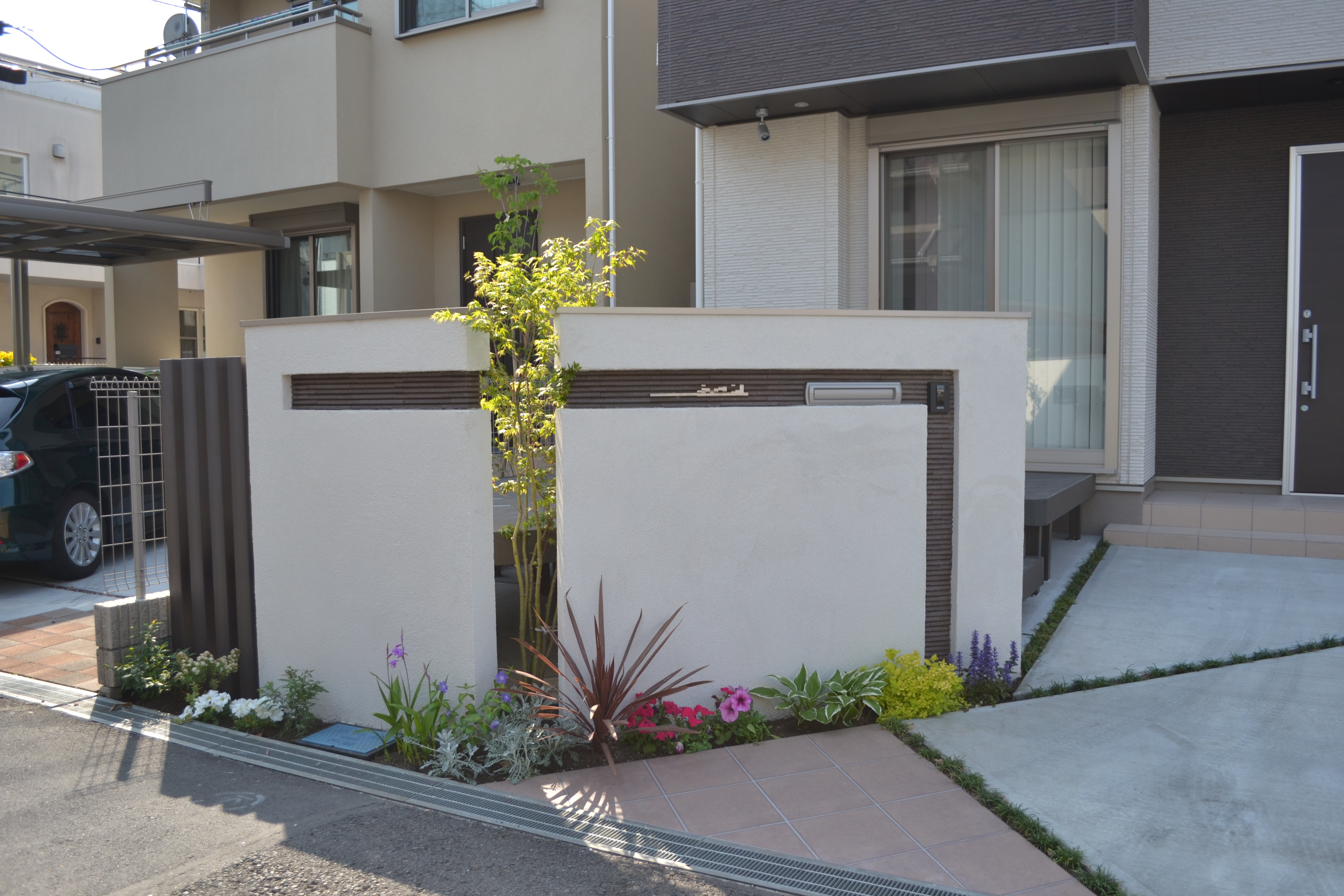 凹凸を加工したりアクセントのタイルを貼った門周りは各現場で建物に似合う提案をさせて頂きさまざまな形で、お洒落な仕上がりになってます。