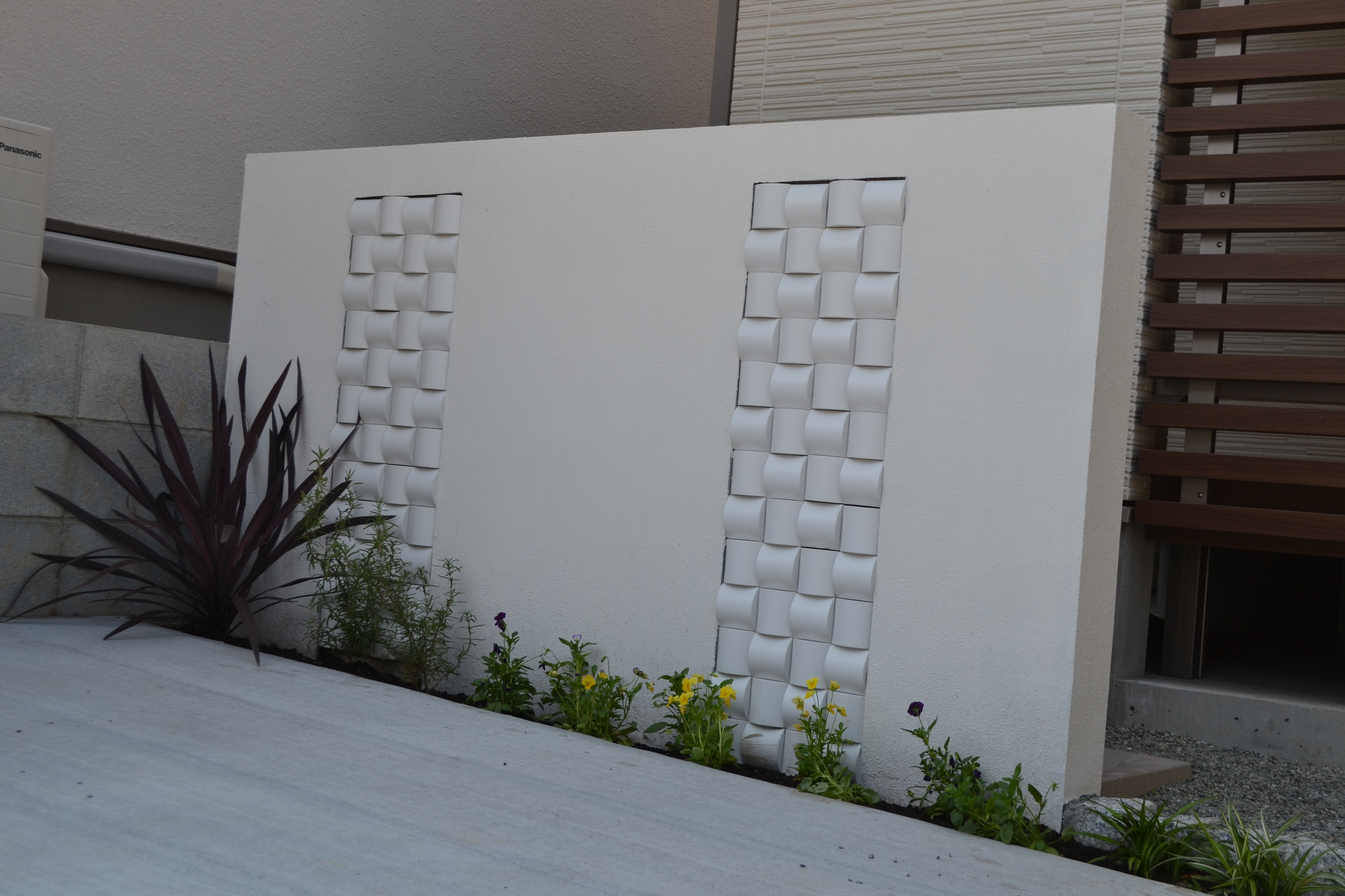 オーソドックスに縦ラインの凹凸を加工して凹んだところにモザイクタイルを貼りました。