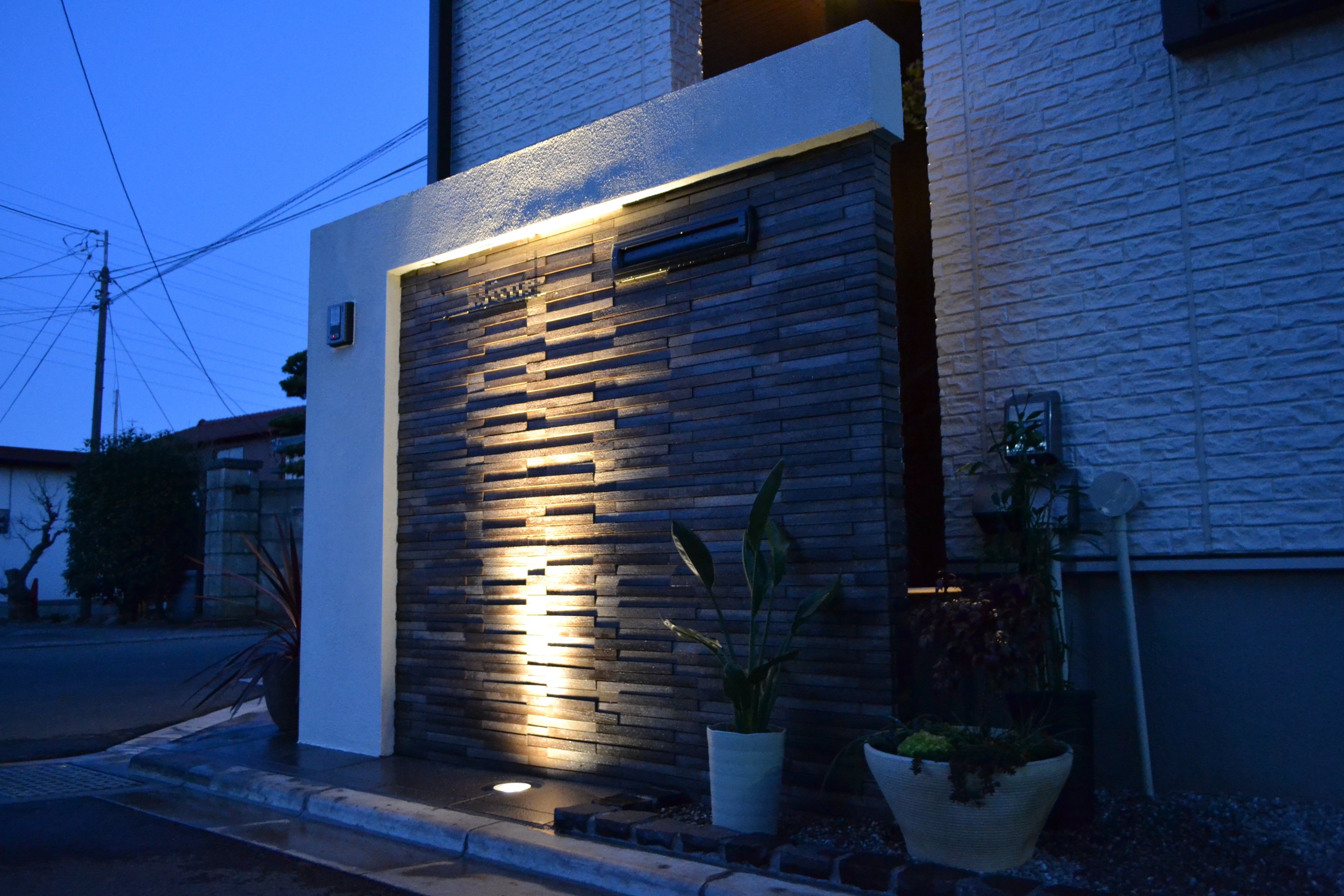 夜のシーンでも照明をうまく使う事によって、さらに門周りをお洒落に見せろことが出来ます。