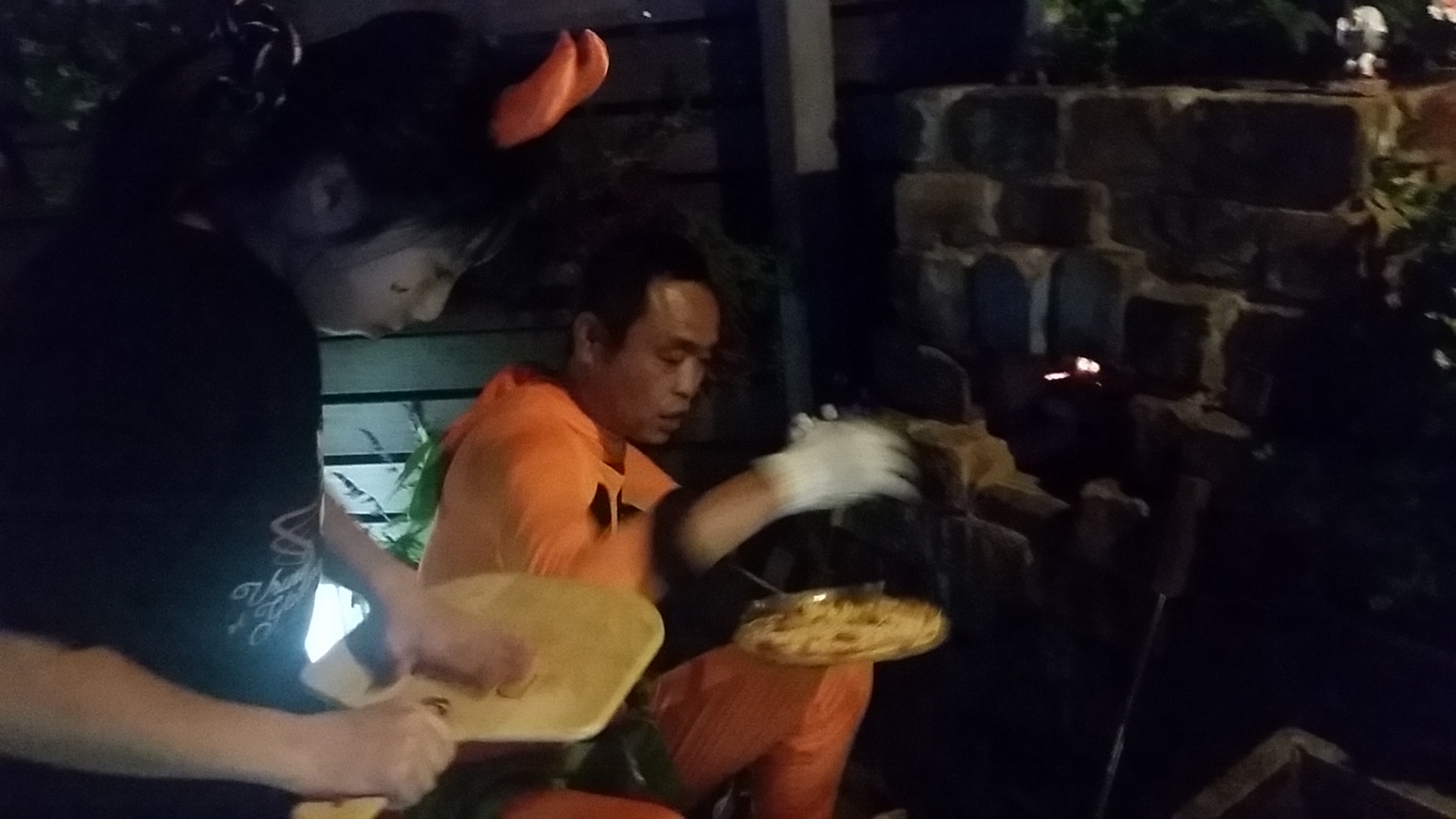お酒も飲まずシラフなカボチャマンは子供たちのお腹を満足させるためただ一人、ピザ窯の前でひたすら人数分のピザを焼いているのでありました。