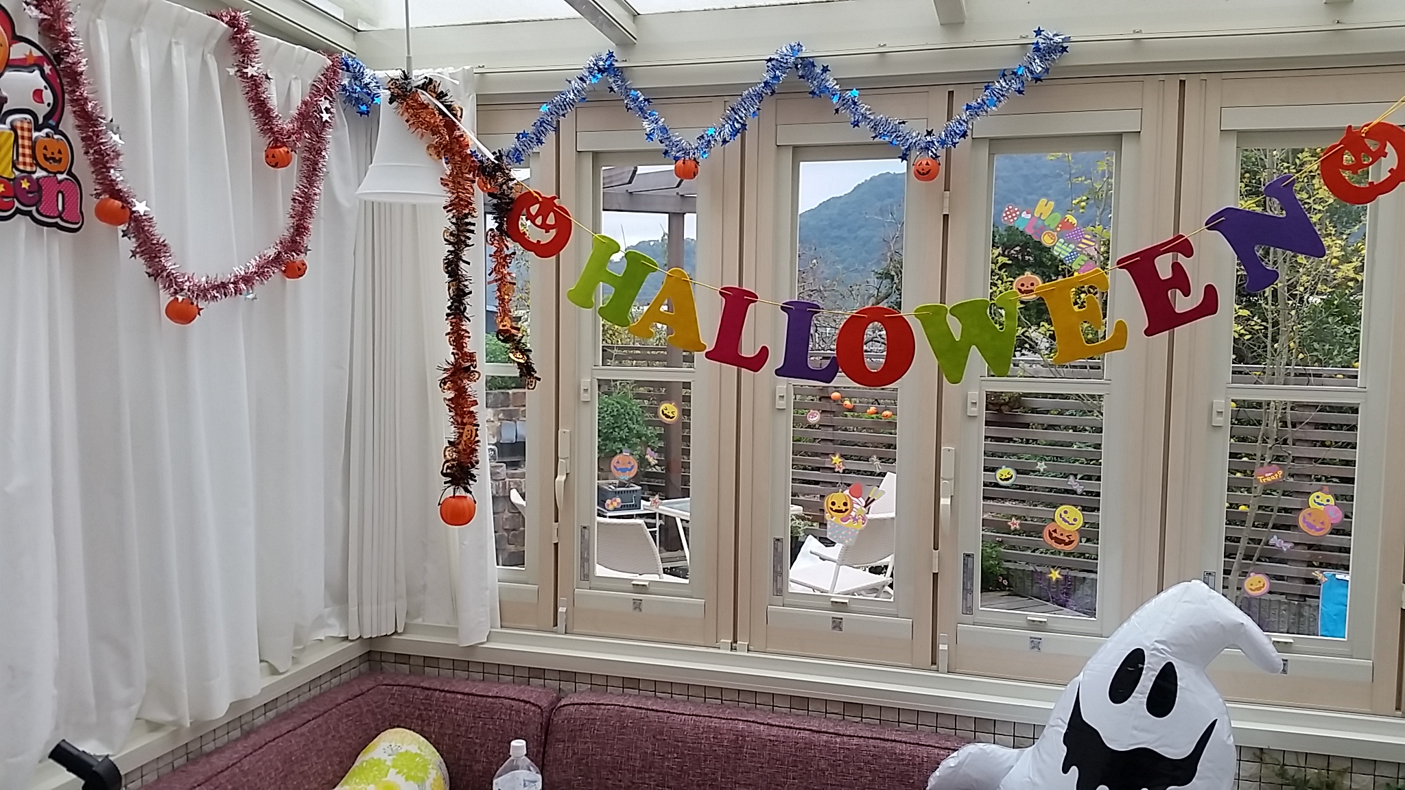 先ずは、元気な子供たちが好きに遊べるようにお庭とガーデンルームをハロウィーンっぽく装飾からスタート(^^)ホワイトのガーデンルーム内に色とりどりの装飾品が飾られただけでなんだか楽しい気持ちになります。