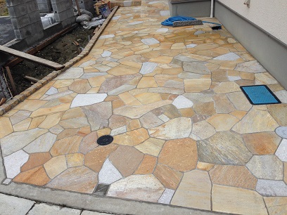 アプローチからそのまま駐車スペースまでデザインされた乱貼石。