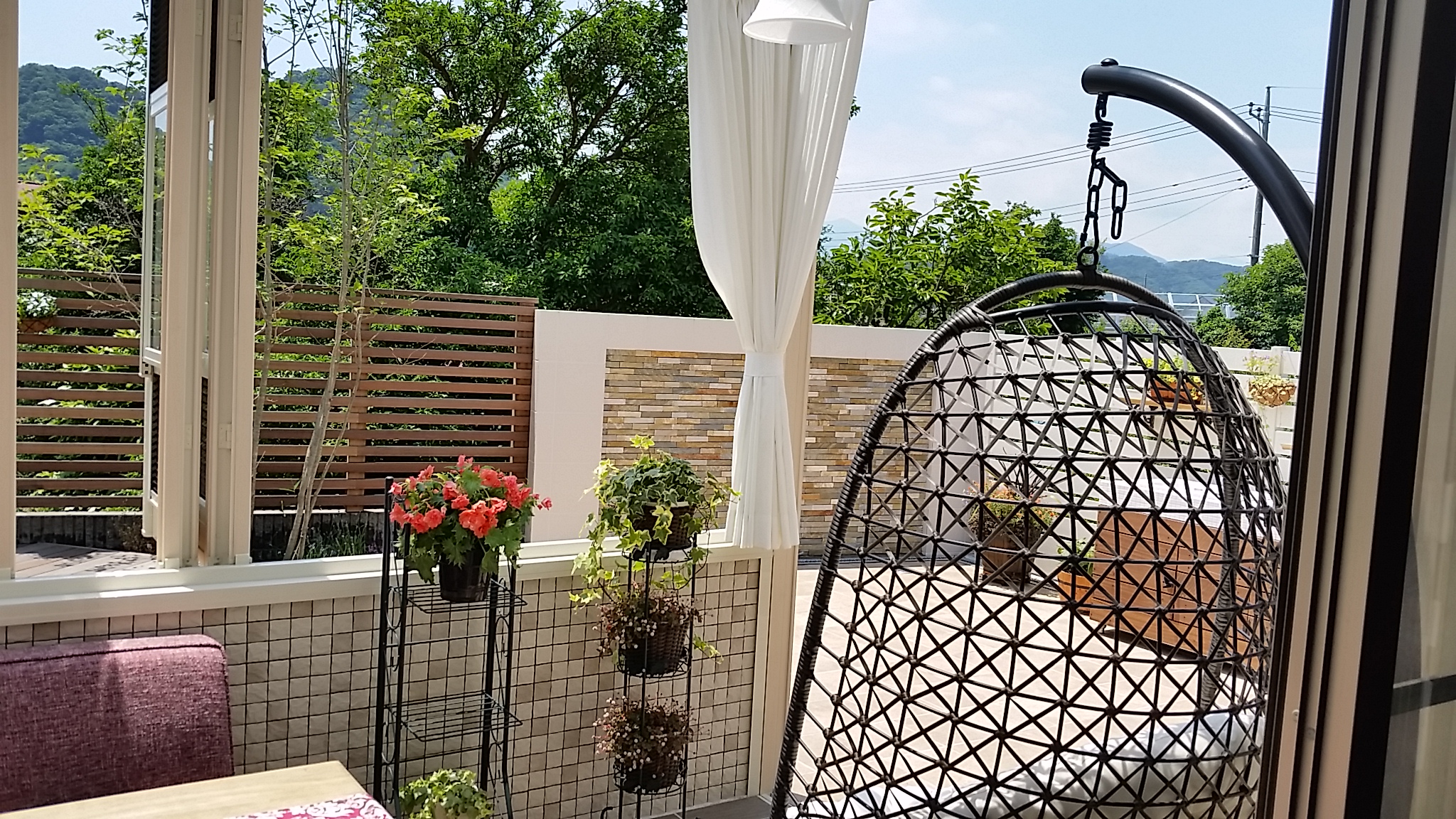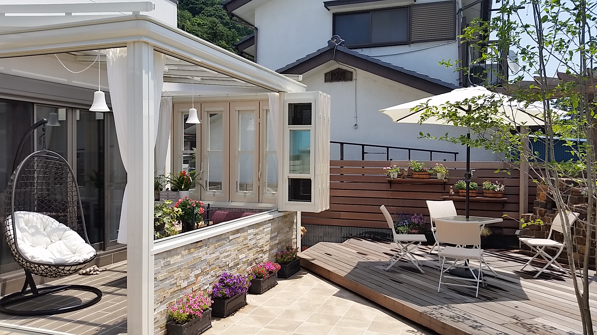 フルオープン仕様など種類も豊富にあり、折戸を閉めればイスやテーブルを置いてセカンドリビングとして活用。全開にすれば庭へとつながるテラス空間!