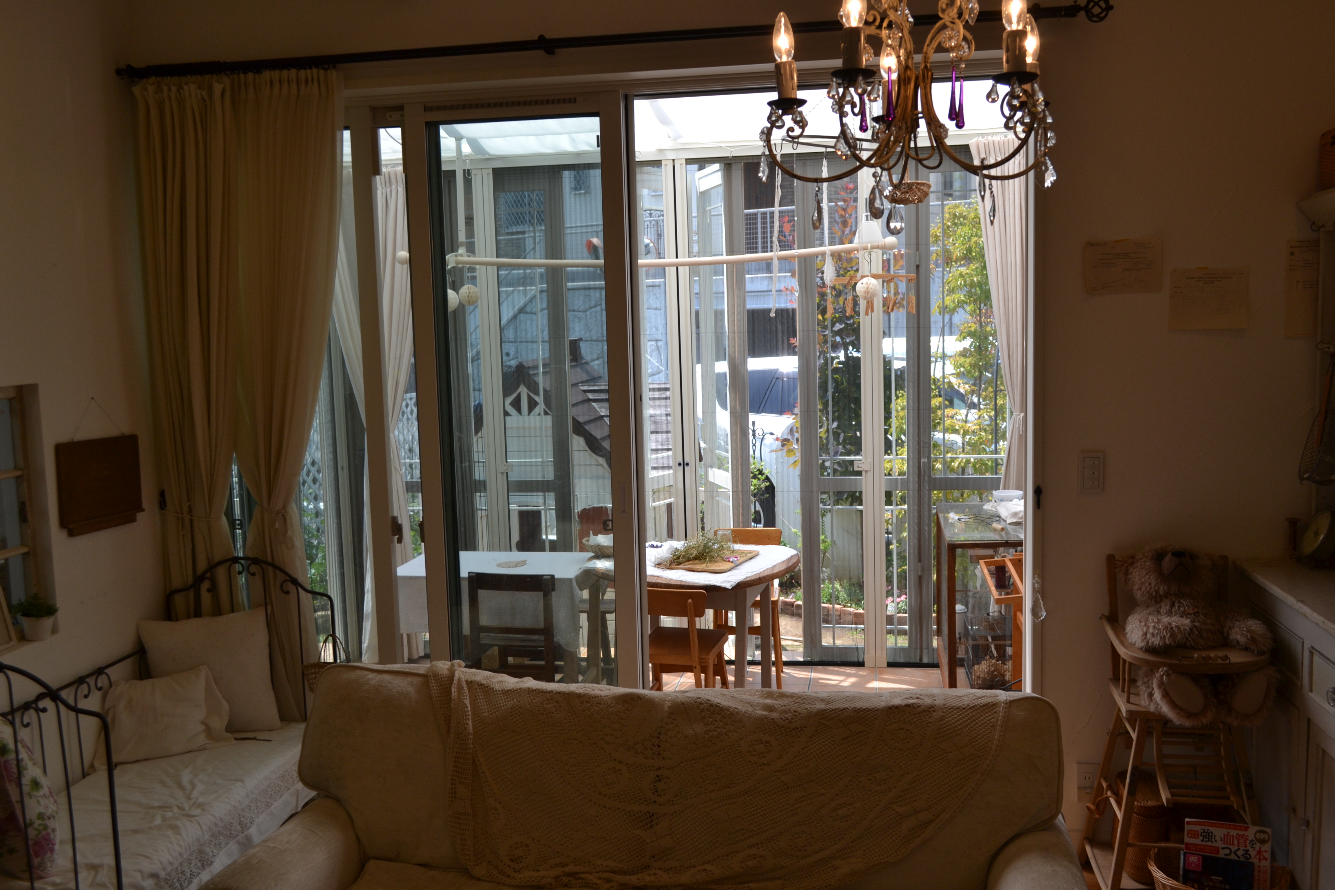 折れ戸をオープンにすれば外の空気や風が心地よいテラスとして!クローズにするとガラスに囲まれた開放的なリビングルームに変身!