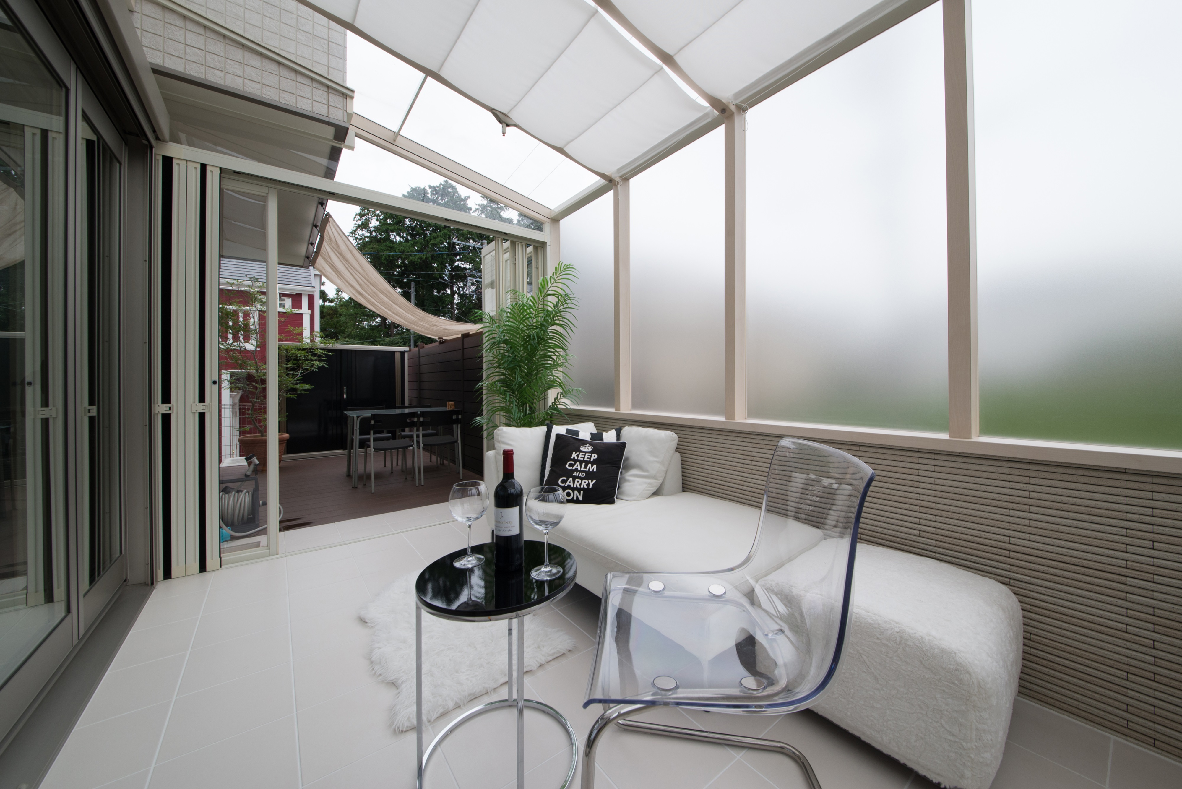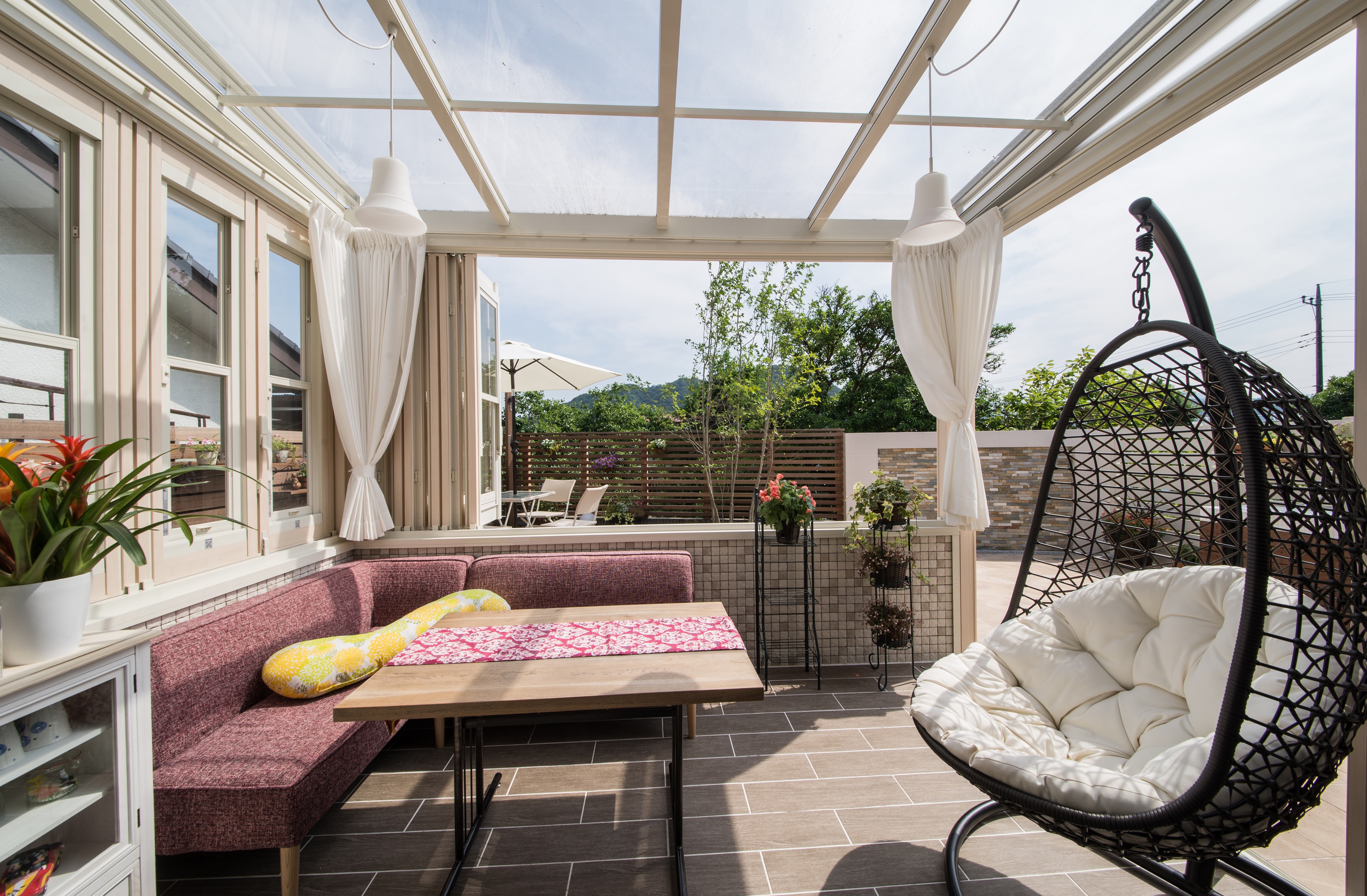 家のリビングルームからお庭に向かって広がったサプライズ空間!リビングルームからタイルのテラスに一歩出ると家とお庭の中間スペース、今まで体感したことの無い開放的な気分が経験できます。