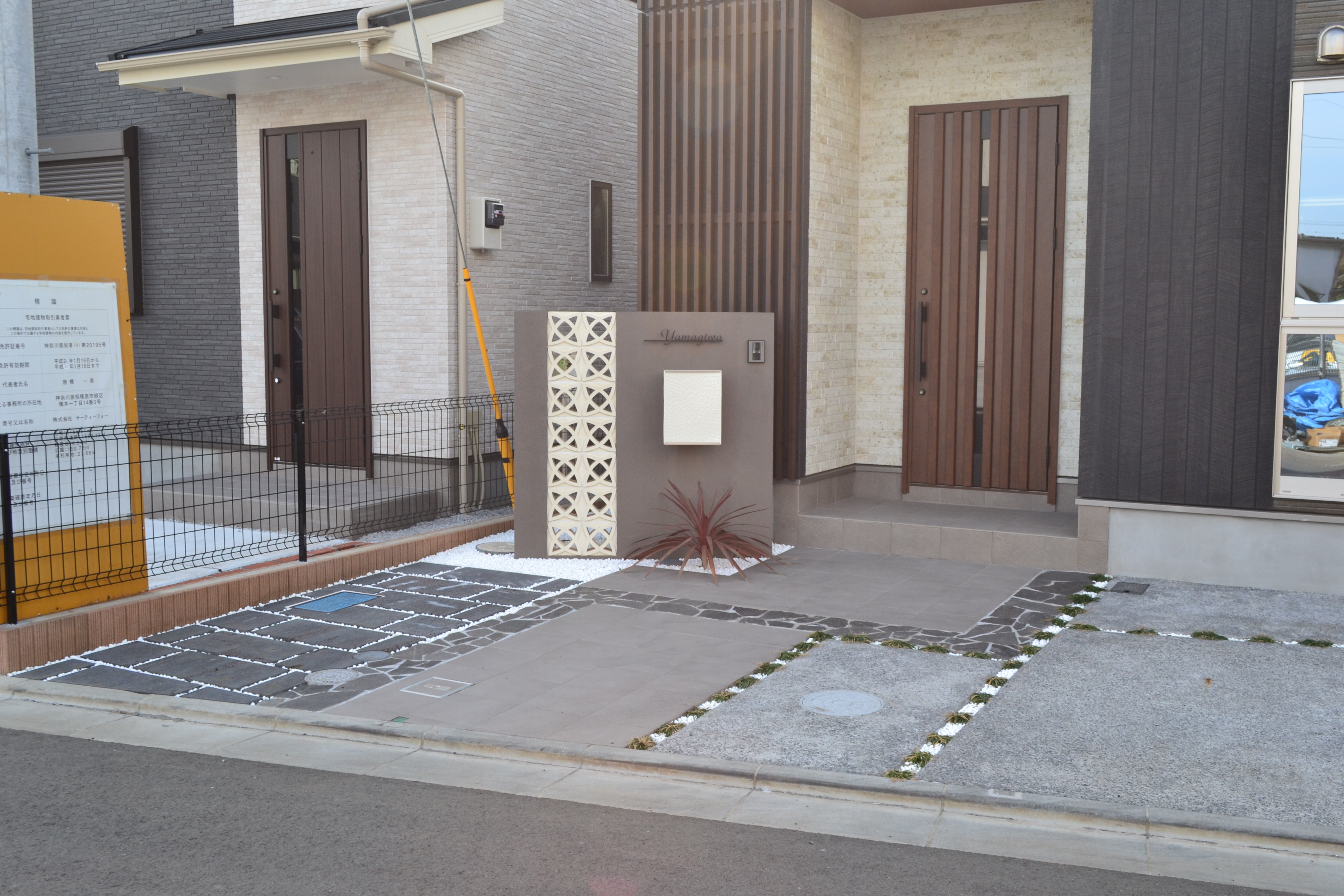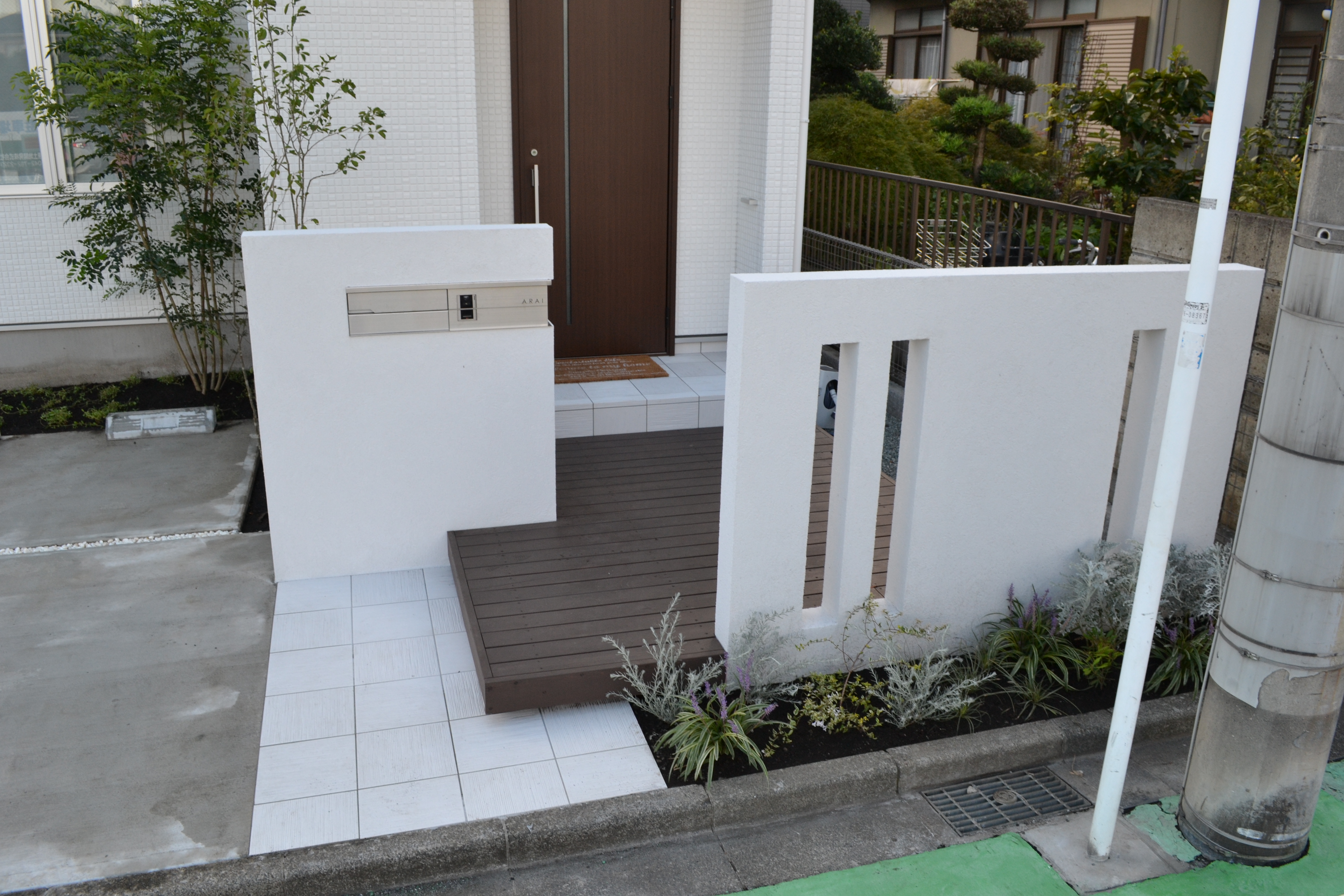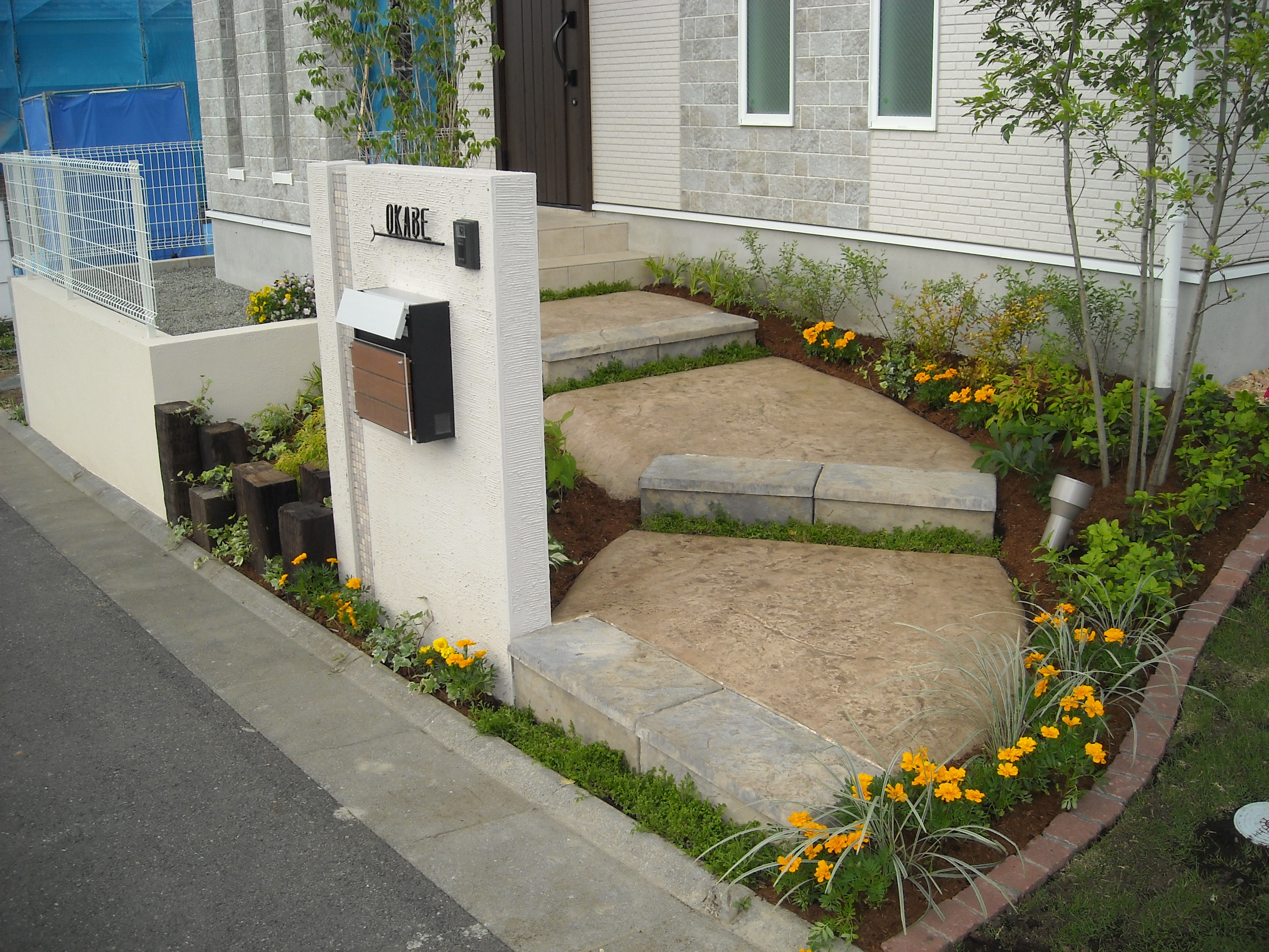 こちらの現場では、玄関からステップを斜めに向けて提案、限られたスペースの中に建物と門まわりの調和が綺麗に納まった現場です。