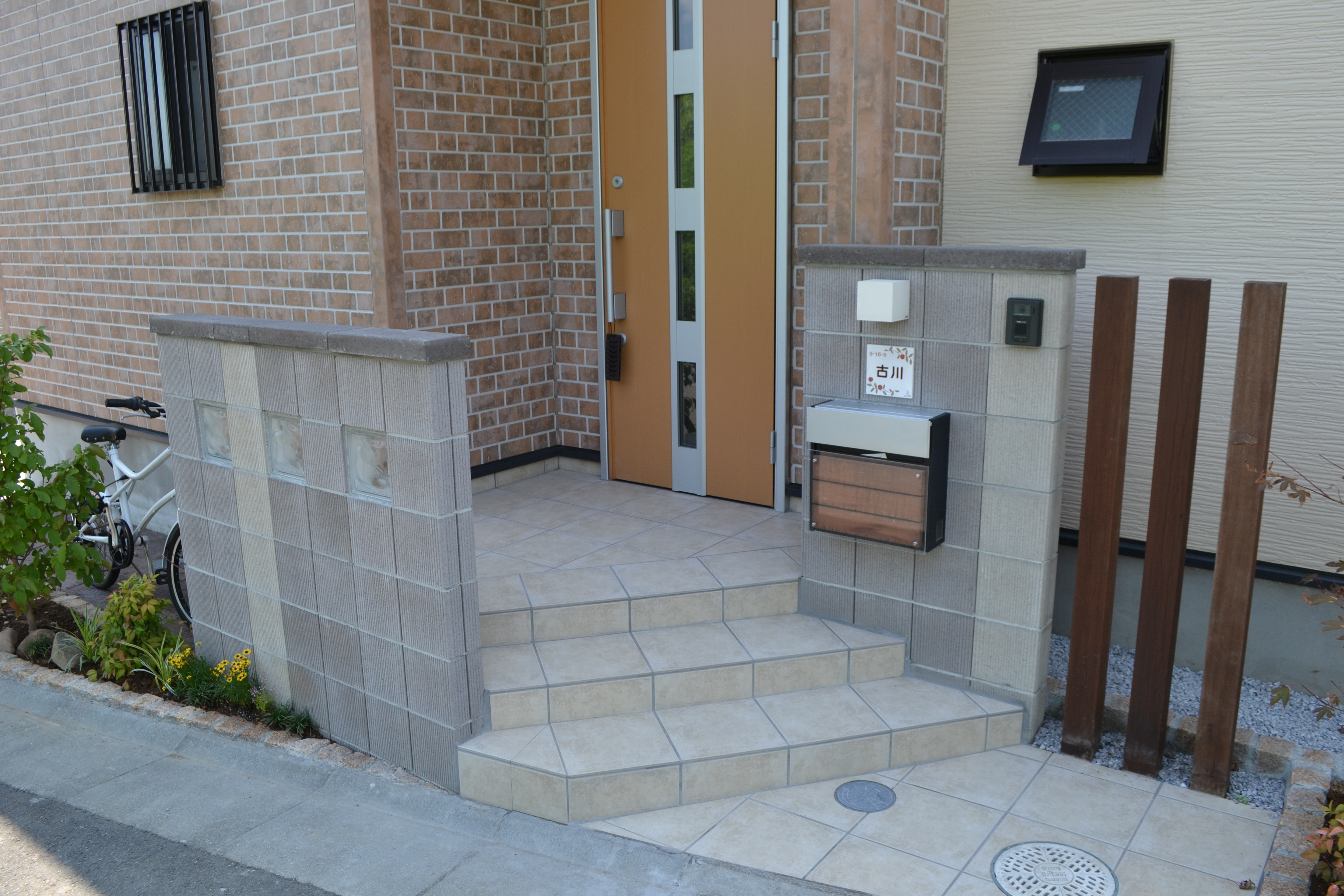 玄関開けると目の前はすぐに道路、段差があるので工作物は門袖と階段のみ・・という場合でも階段をお洒落にアレンジ(^^)