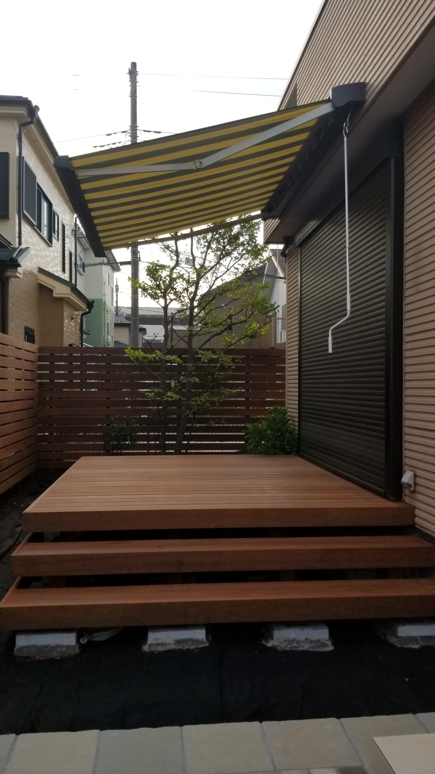 ウッドデッキの上には、日除けが欲しいとご要望がありましたので、出し入れができるオーニングを提案。