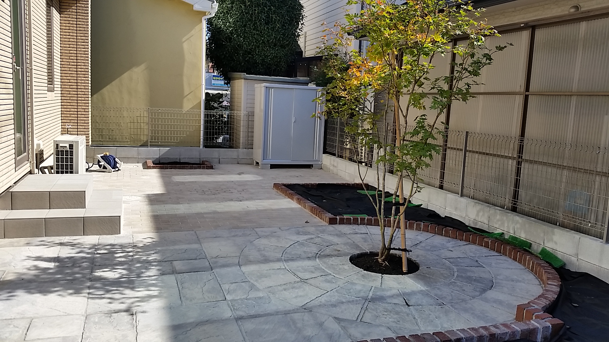 庭周りもデザインの異なる敷石を敷き詰めて雑草予防、シンボルツリーは四季によって色合いが変わるカエデを選びました。