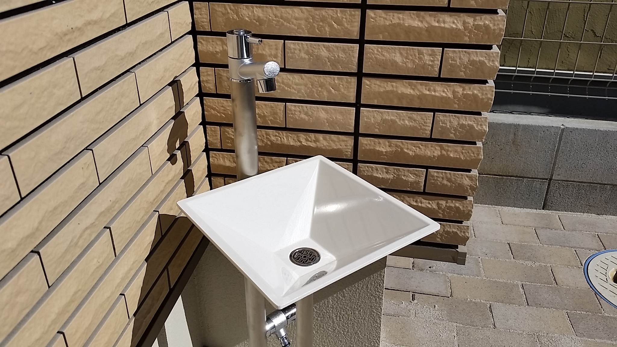 外水道も可愛らしい手洗い水栓(^^) 余っている植栽スペースはご自分で植樹を楽しむのだそうです。