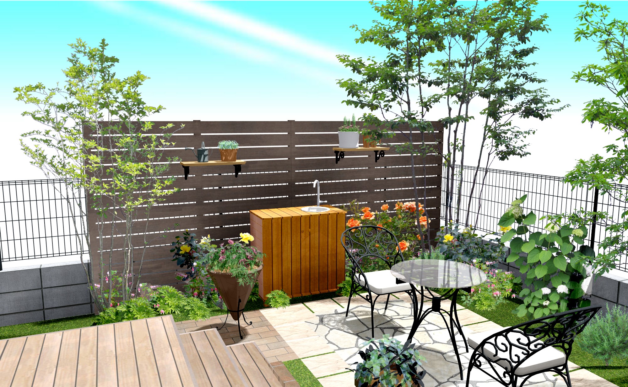 その先は目隠しのウッドフェンスとガーデンシンクをセットしてみました。