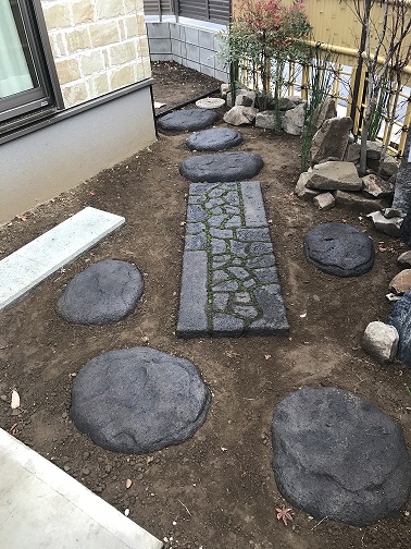 というモルタルで出来た延段と、同じ歩の飛び石を設置しました。
