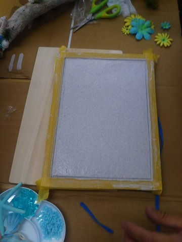 弊社で用意した貝殻や色のついた砂を使って