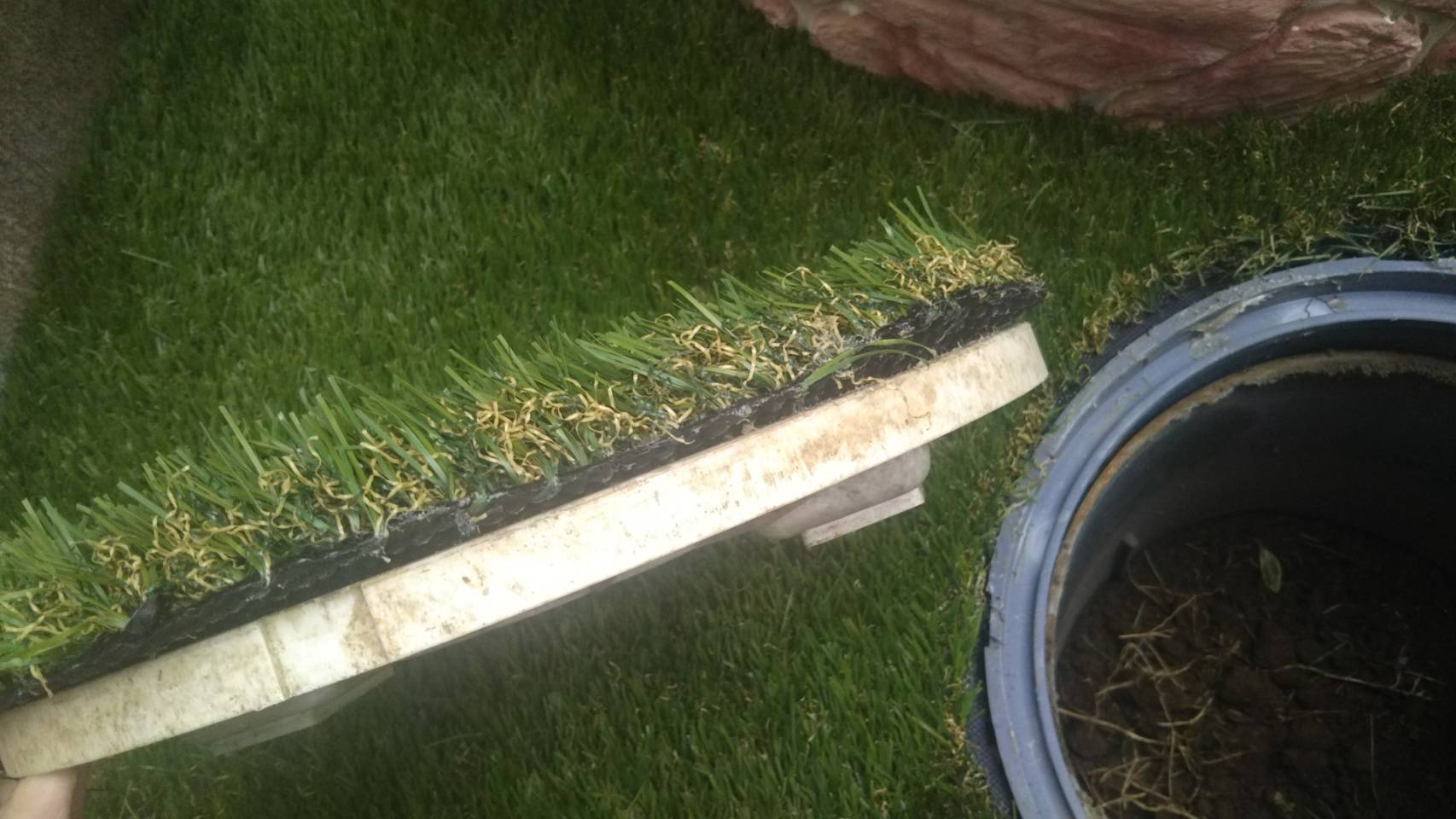 そこでM様とご相談した結果、桝の蓋にくりぬいた人工芝を貼り付けてることに!
