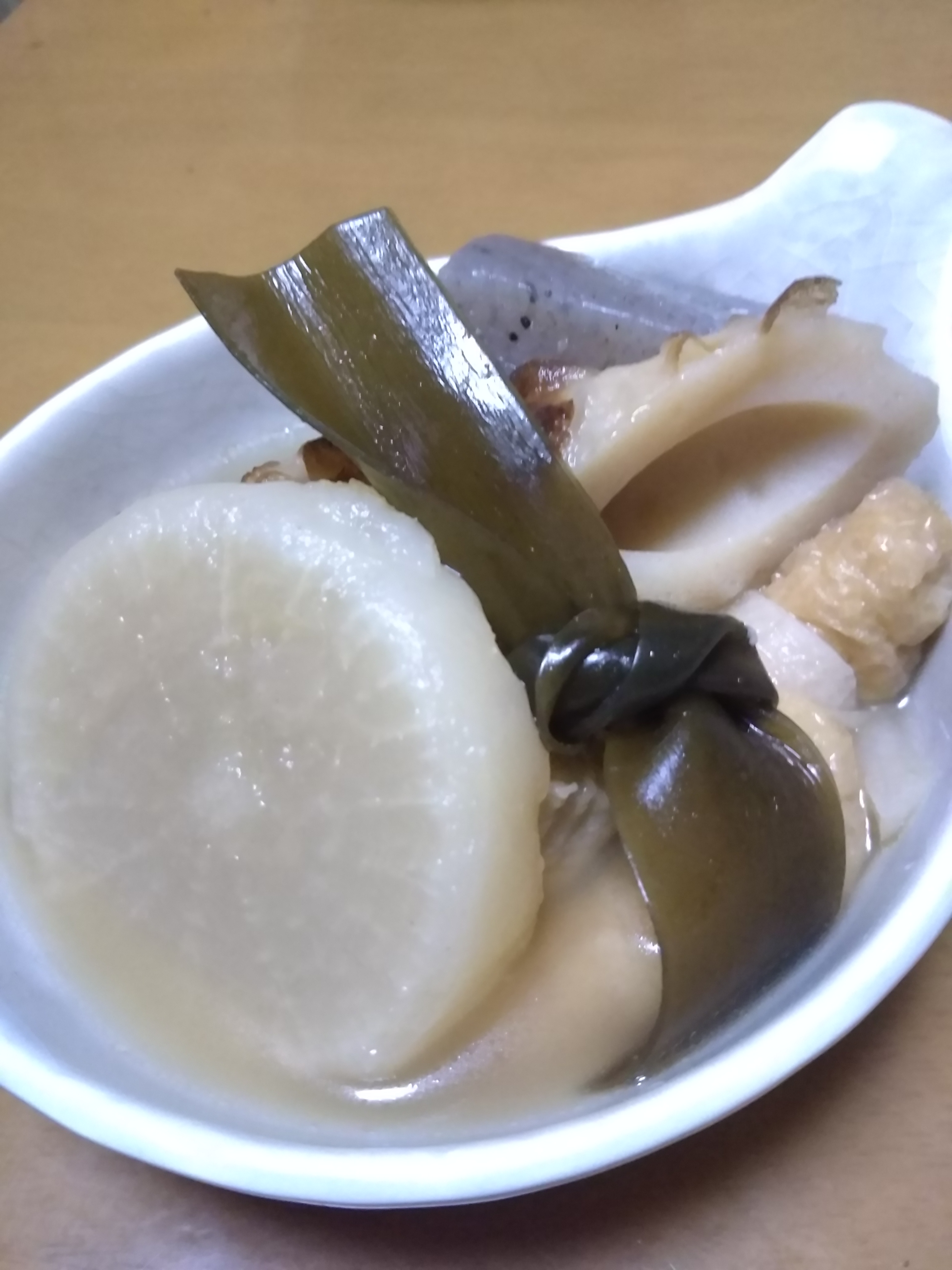 大根は皮を剥いて面取りして隠し包丁。お米の研ぎ汁でコトコト下茹でして灰汁抜きすると白く綺麗に仕上がります♪