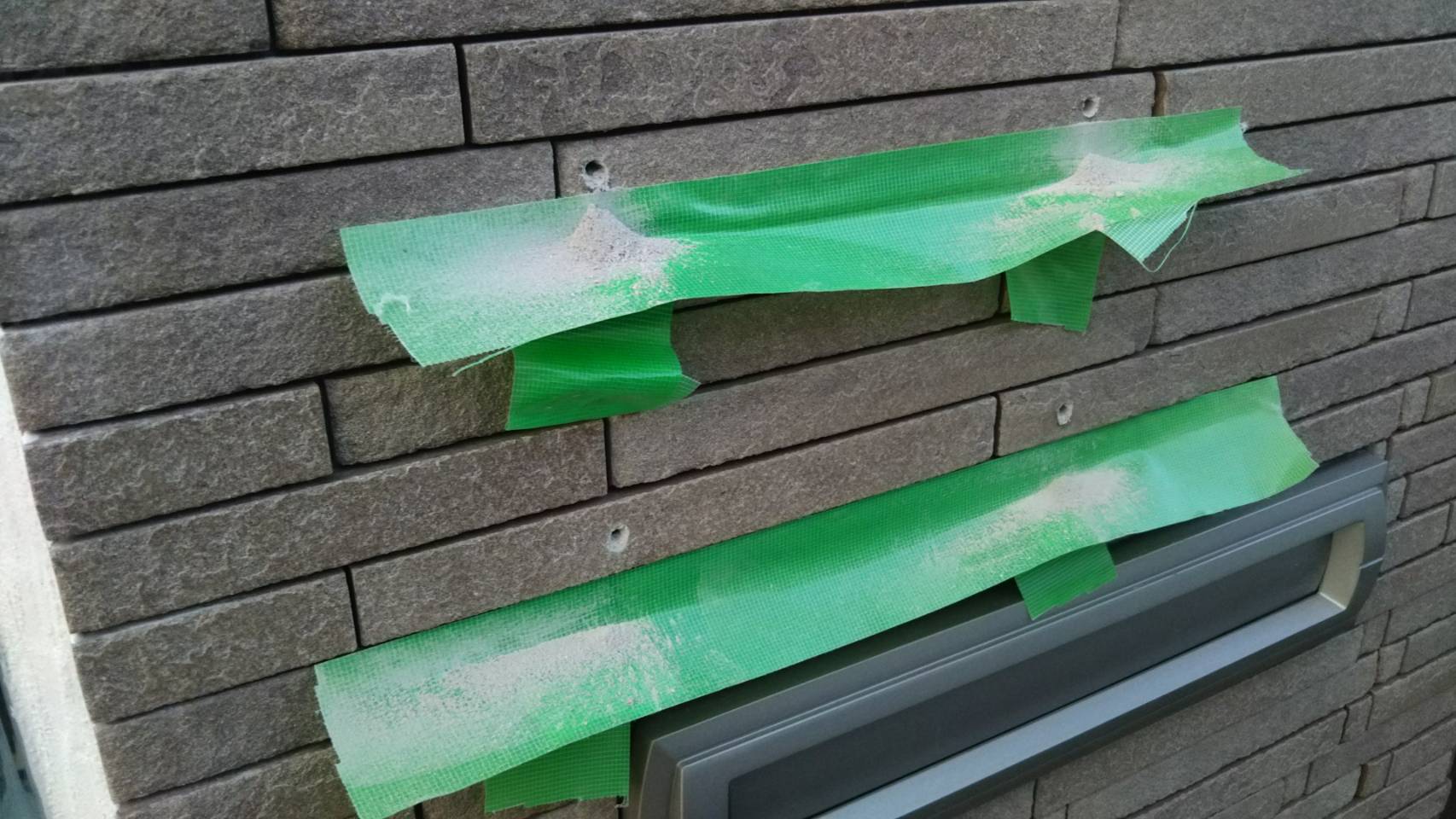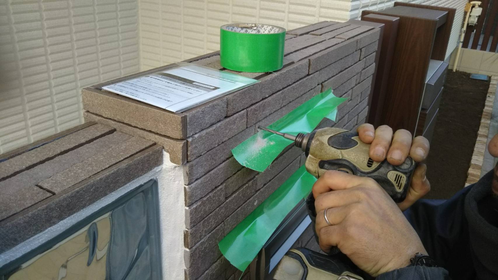 ビスの穴を空けるときに出てしまうタイルやブロックの粉。それがあちこちに飛ばないようにテープで養生。