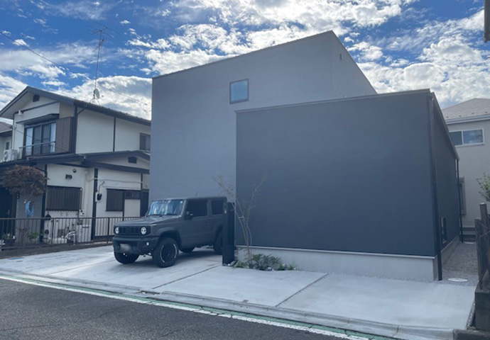 シンプルなモノトーンのキューブ型のご自宅に似合う、シンプルな外構。