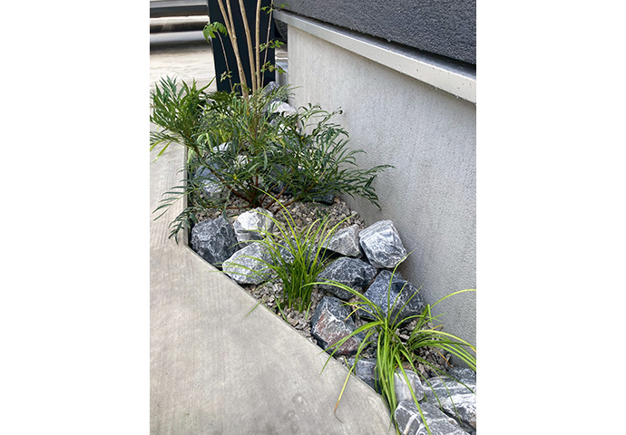 足元には、ガーデンロックとスッキリとしたシルエットの常緑の植物を。