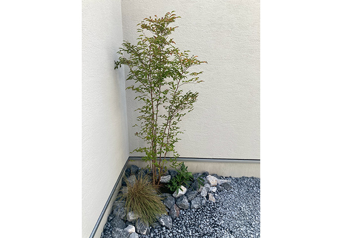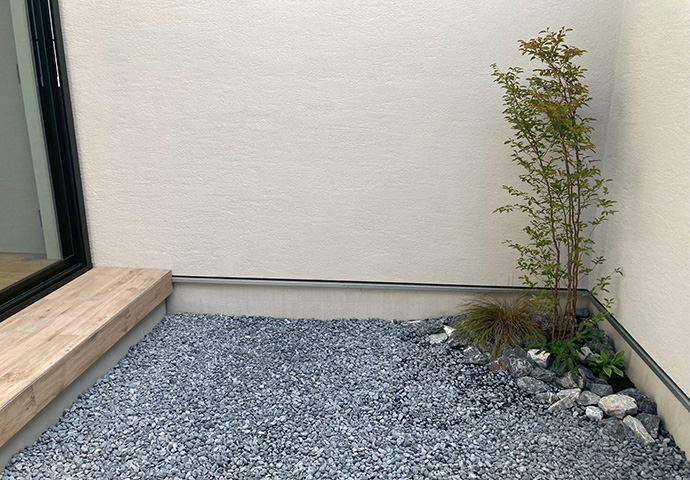 中庭には、化粧砂利のスペースと角には植木を植えています。