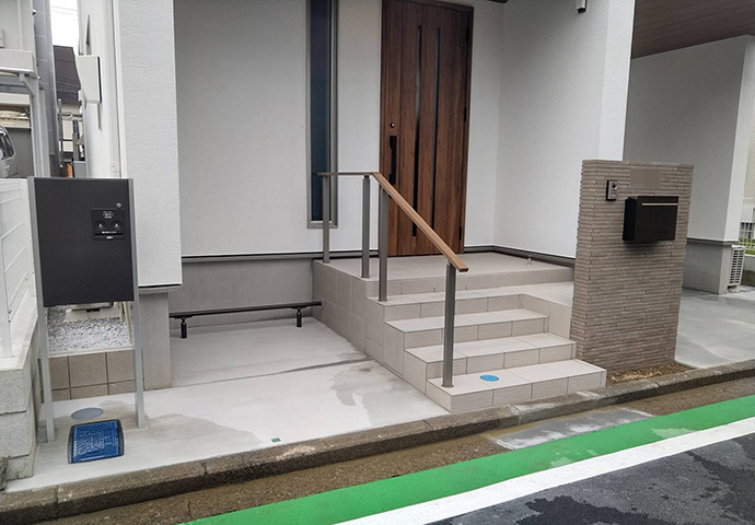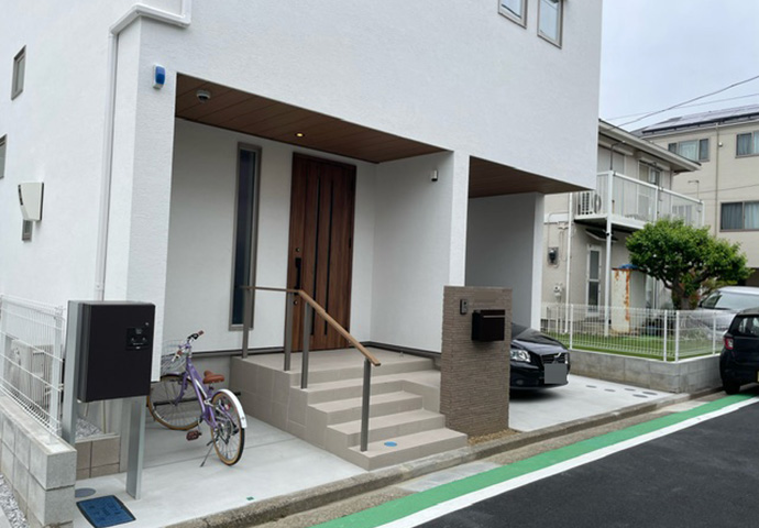 寂雅楽Ⅱの風化したようなテクスチャーと落ち着いたナチュラルな色が、ご自宅によく似合っています。階段左側は自転車置き場です。