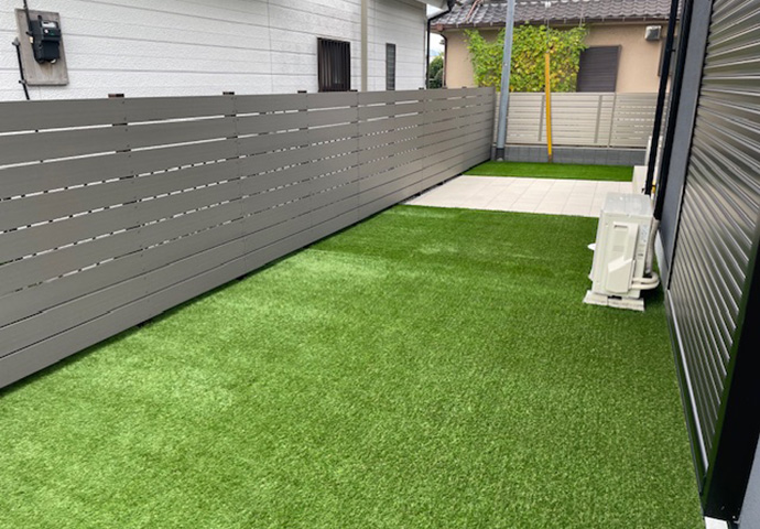 庭側には、人工芝とタイルデッキ、樹脂製の目隠しフェンスを。