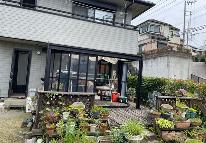 広いウッドデッキに初期の懐かしいガーデンルームが設置されたお庭でしたが、経年劣化によりウッドデッキは危険な状態でした。