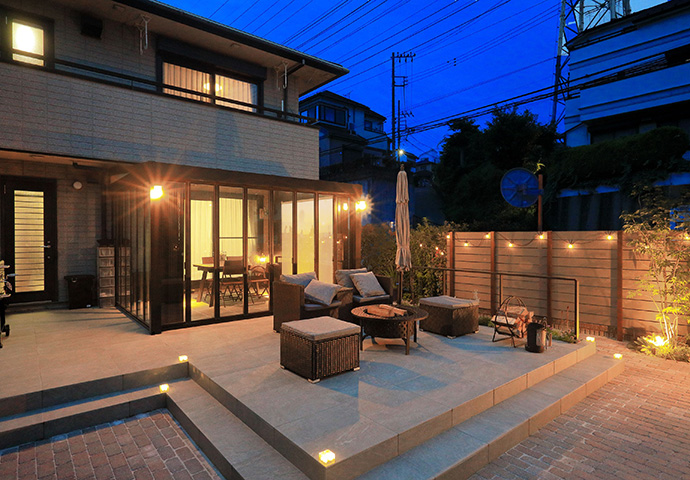 ガーデンルームから繋がる大きなタイルテラスにインターロッキングのお庭。
