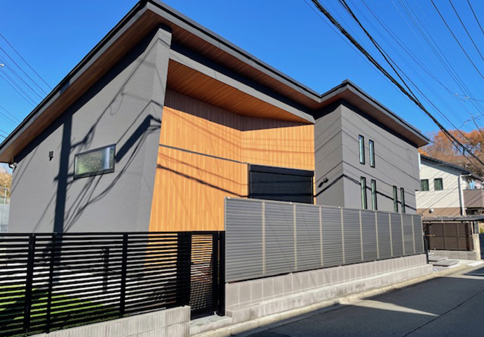 目隠しフェンスは、高さ1.4m。自宅にも景観にもなじむシャイングレー色。