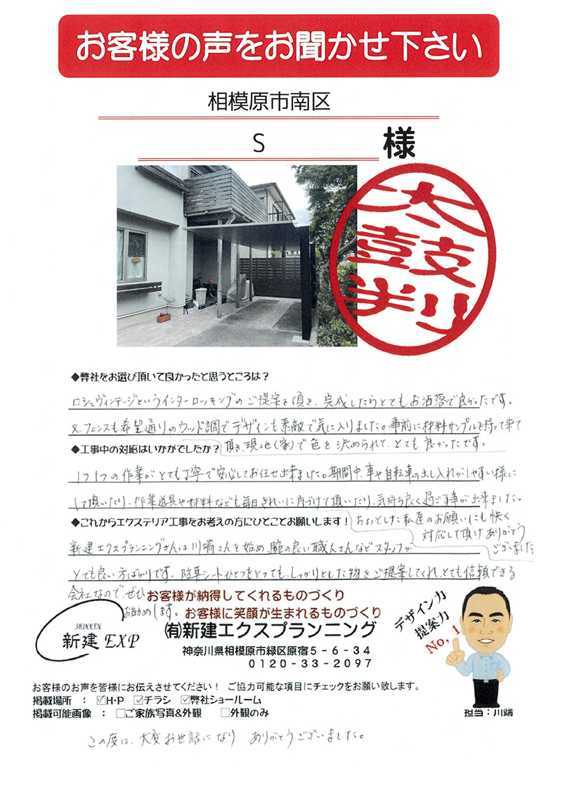 エクステリアの知識がない私に細かく解りやすい説明とパソコンを使ってのシミュレーションを見る事により、より一層イメージが沸きました。また、こちらの意見を聞きつつも川端さんの今までの多くの施工例の意見をくださり、良いアドバイスをもらう事ができました。話が進む中、私達が悩んだ時相談するとハッキリと良し悪しの意見をいただけ、こだわりの強い頑固な旦那さんが、川端さんの事を気に入り、新建さんに施工をお願いする事に決めました。