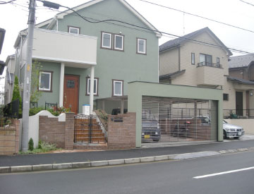 駐車場は大型シャッター・カーポート屋根を施工し、門袖・アプローチ階段はレンガで統一。乱貼石...