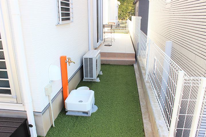 階段だと認識しやすいだけでなく、タイルテラスのアクセントにもなります。立水栓がオレンジ色のE様邸では、タイルテラスと立水栓を繋ぐ色となりますね。