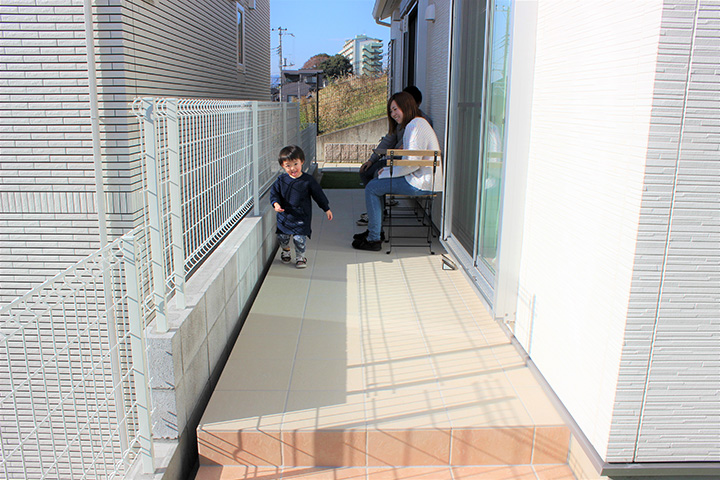 リビング前のタイルテラスはちょっとしたお茶をしたり、家族で過ごす、思い出を作る場所へ。