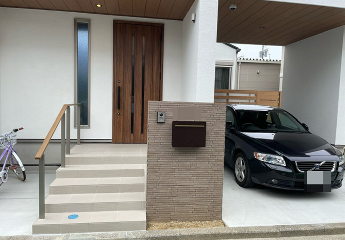 ブラウン系の外構アイテムと自宅のアクセントが、ご自宅全体の統一感を生んでいます。