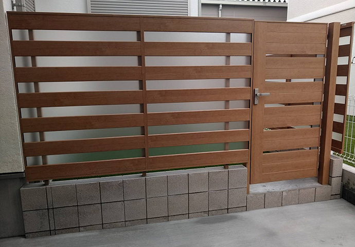 LIXILのフェンス、フェンスAAYT1型は、木調パネルとポリカーボネート板を使用した、目隠しと採光を両立させたデザインで圧迫感がなく目隠しが出来ます。ナチュラルで落ち着いた外構になりました。
