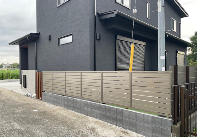 通りから見えるフェンスは、景色に溶け込むシャイングレーに。ブラックほど主張の強くないシャイングレーなので、広い面積をとるフェンスでも、自宅や外構に馴染んでいます。