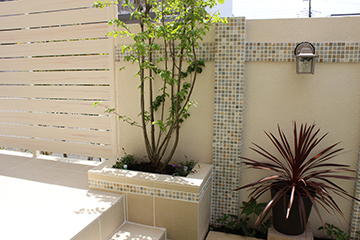 光さすお庭に、木目調フェンス&アクセントウォールの白と、シンボルツリーのやわらかな葉とのコントラストが、明るく上品な空間を、さらに美しくやさしい空間へ誘ってくれます。