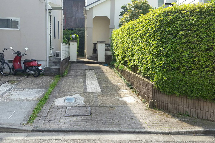 E様の駐車場兼、アプローチのBefore写真です。床・舗装面が経年劣化だけとは言い難い、不陸が生じており、少し止めにくい駐車場になっていました。