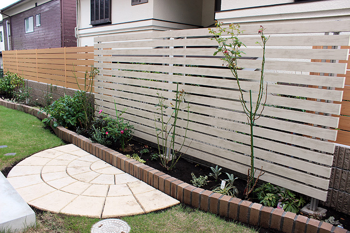 残した既存の白い目隠しフェンスの前はローズガーデンに。いつか花盛りになったら素敵になるでしょう。