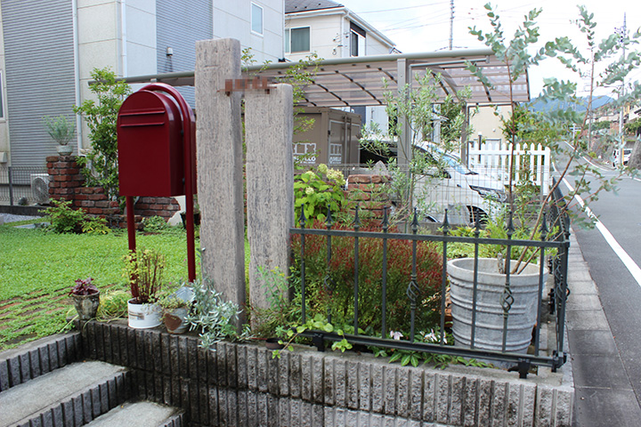 地面の下に排水の工事をし、水はけの問題を解消しました。もともとあった枕木の門袖を擬木に変えることによって、劣化しにくい門柱となりました。