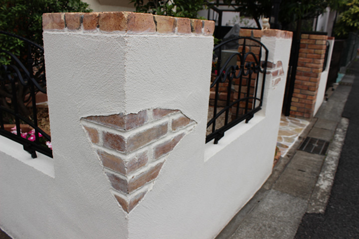 既存の門扉と照明はそのままに、レンガの門柱と門袖、そこからの続きの様なアンティークの加工を施した門袖で、元からあった門扉でも印象がかなり変わりました。