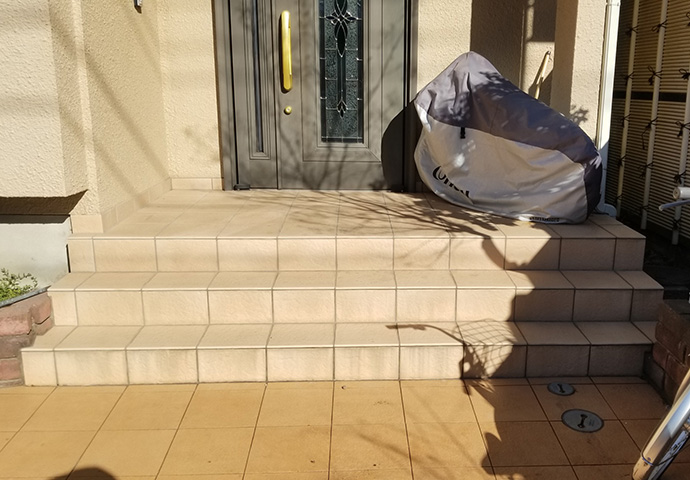 広い玄関ポーチに幅いっぱいの階段で、タイルはアプローチに合わせてベージュでした。