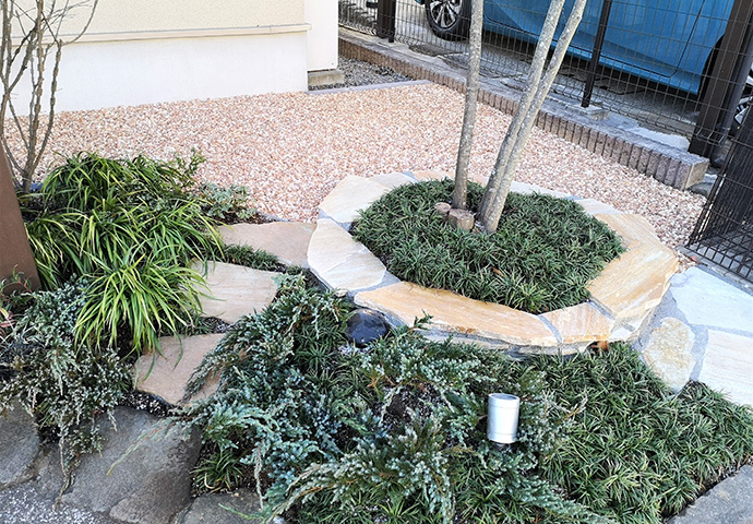 庭への通り道は樹脂で固めた化粧砂利とし、手前の植栽は手がかからずに美しくなるように、丈夫でお手入れの簡単な植物を植えました。