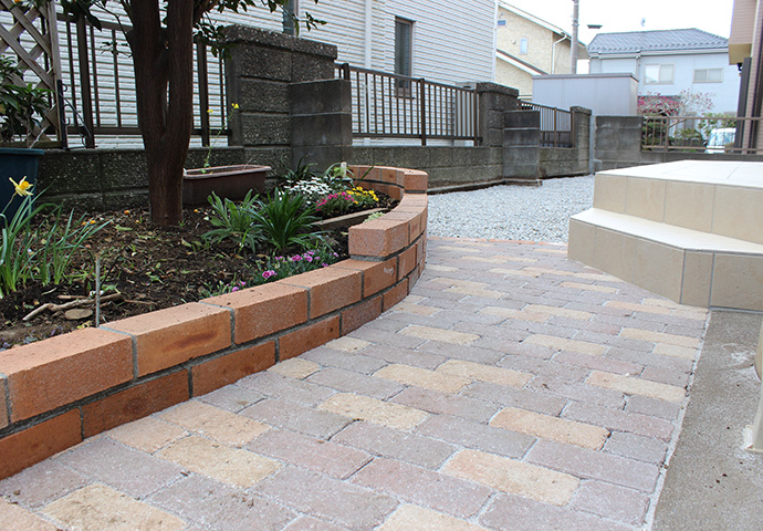 玄関側からインターロッキングでアプローチを造り、庭へ行きやすくしました。