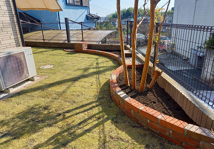 植栽スペースはレンガで区切った左右のスペースのみになったのでお庭が広々と使えるようになりました。