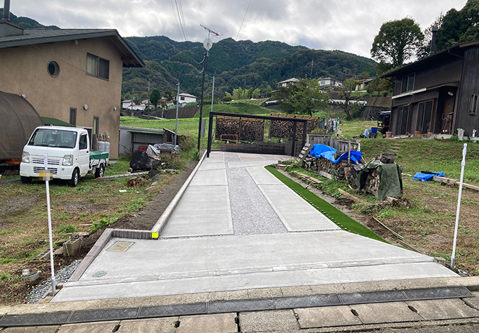 駐車スペースからご自宅までは緩やかな通り道。地面は土のままで、足元が不安定な上、雨が降ると大変でした。