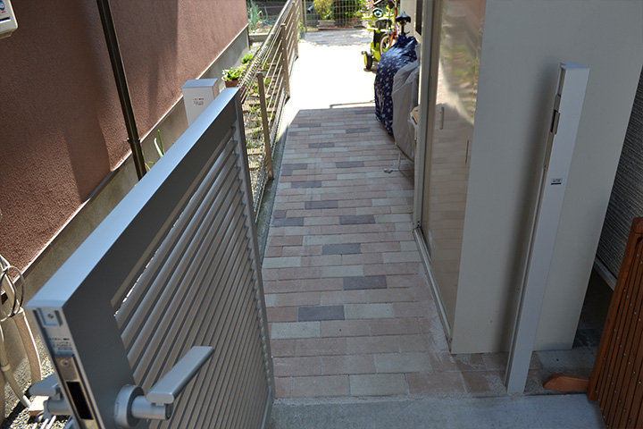 お庭へと続く裏口には門扉を設置し、インターロッキング舗装を施しました。敷地内全て、メンテナンスフリーの空間に生まれ変わりました。
